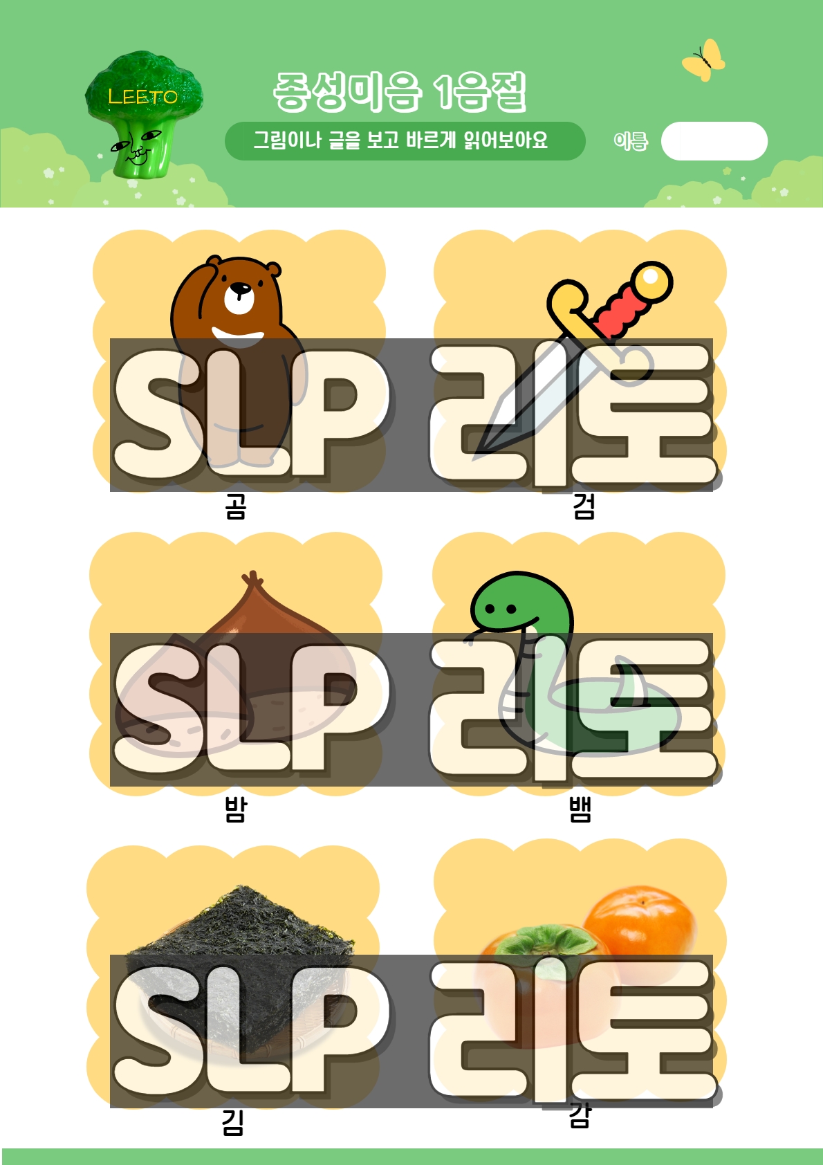 종성ㅁ 발음 향상에 도움을 주는 자료입니다. 1음절부터 4음절까지의 단어로 구성되어 있습니다.