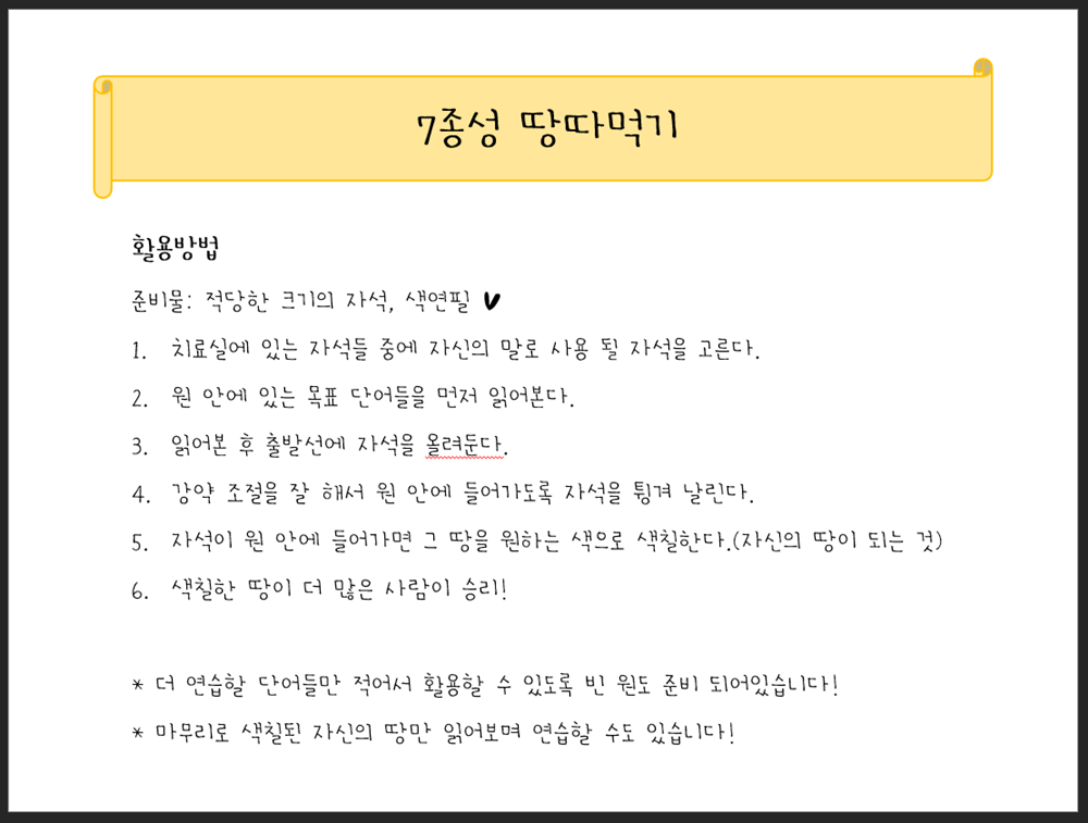 사용방법을 읽어보시고 따라하시면 아이들도, 치료사도 모두 즐겁게 가능할 거에요:)