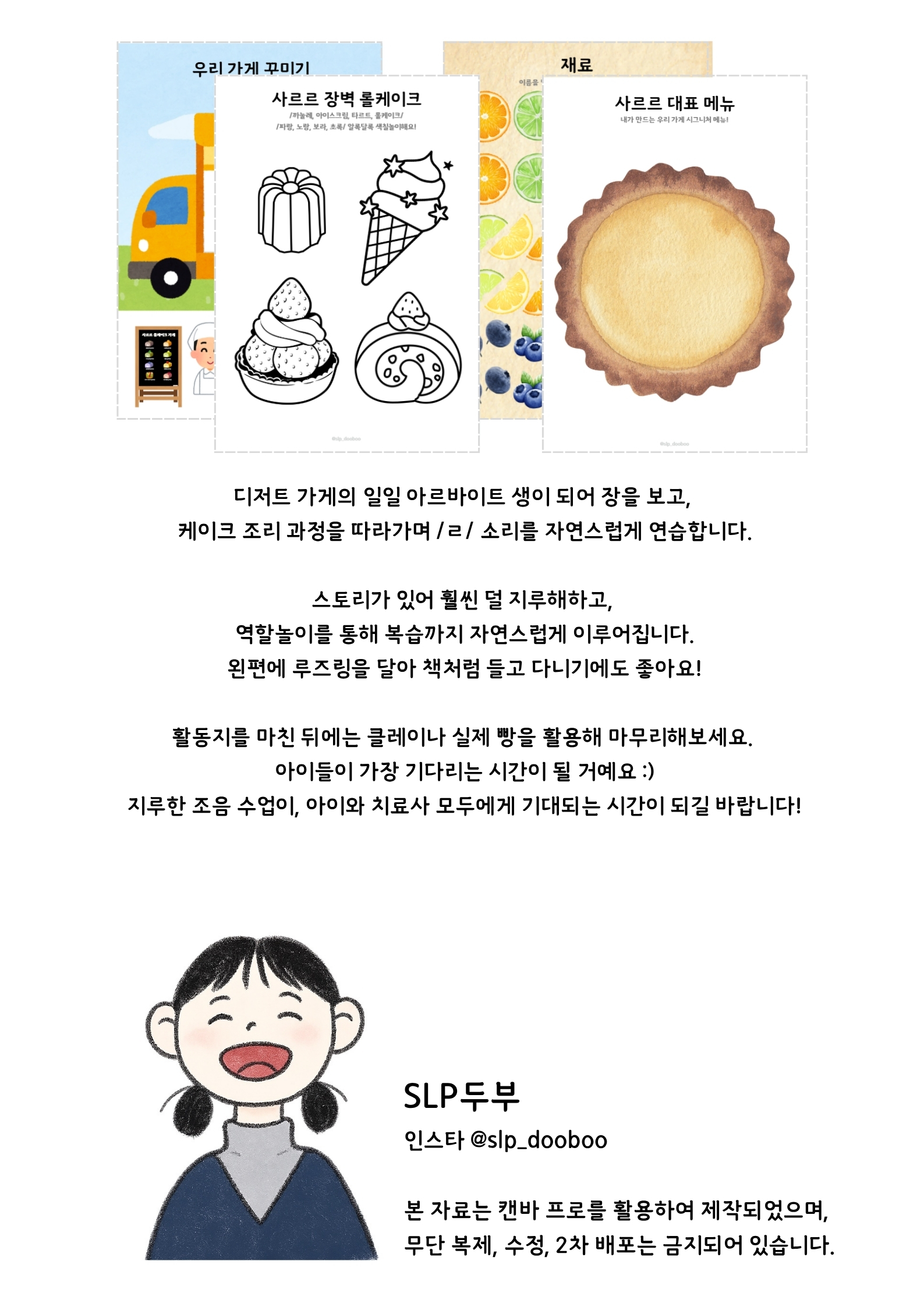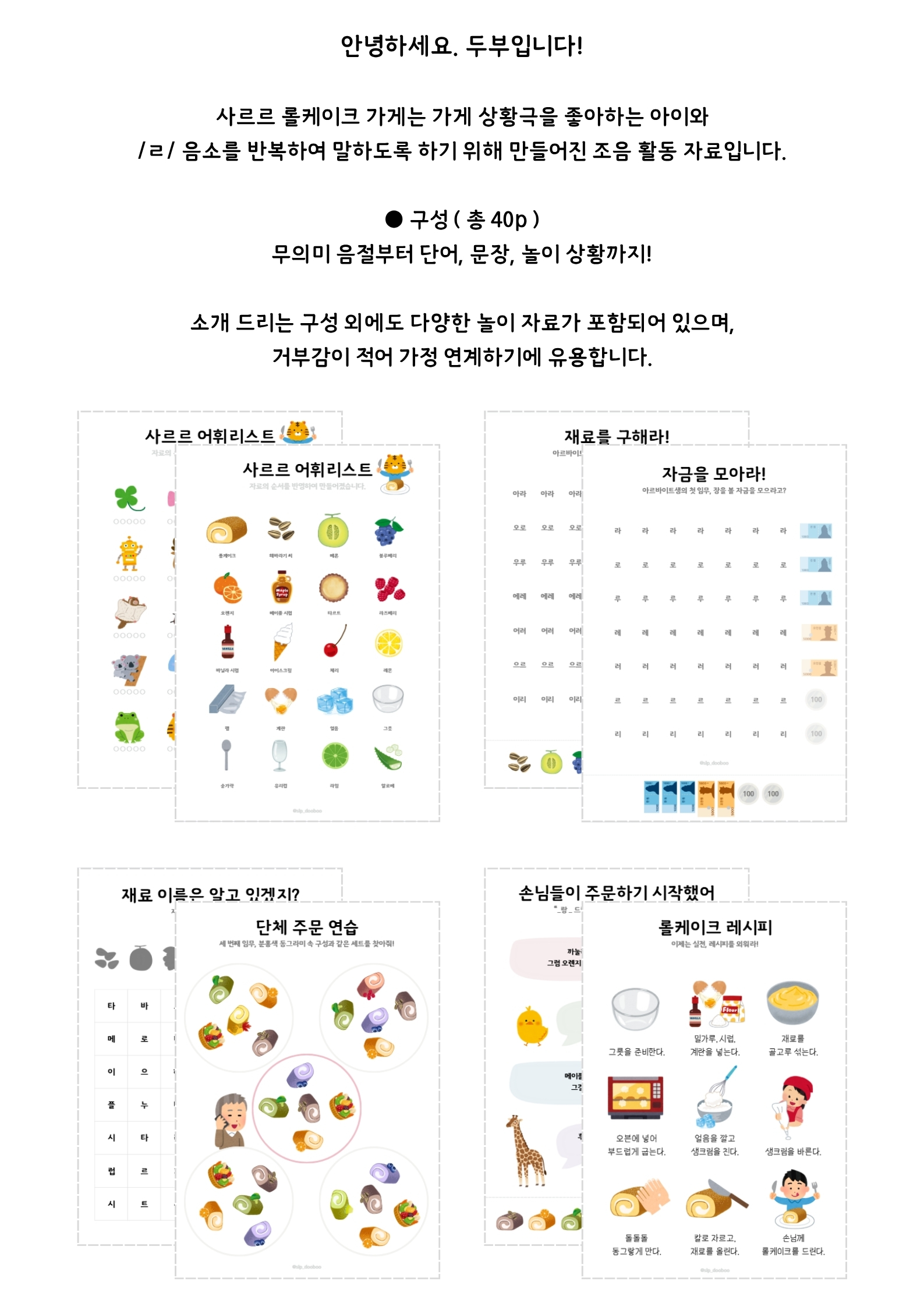 /ㄹ/ 조음 중재 아동과 함께 놀이하며 공부할 수 있는 디저트 가게 주제 자료입니다.