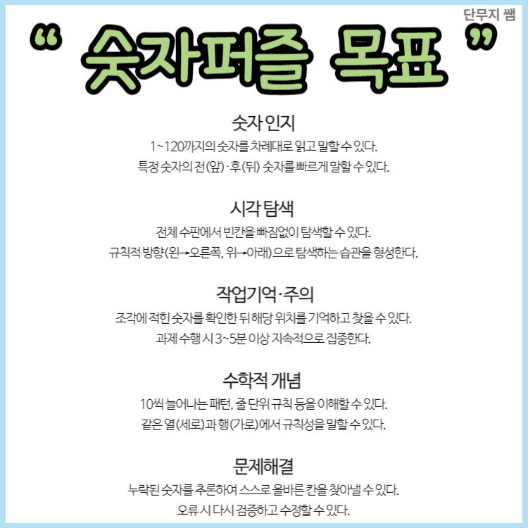 수 개념 발달 / 작업기억 및 주의집중력 강화 시지각·공간 인식 능력 향상 / 문제해결력 및 계획 능력 훈련 목적을 둔 활동지 입니다.