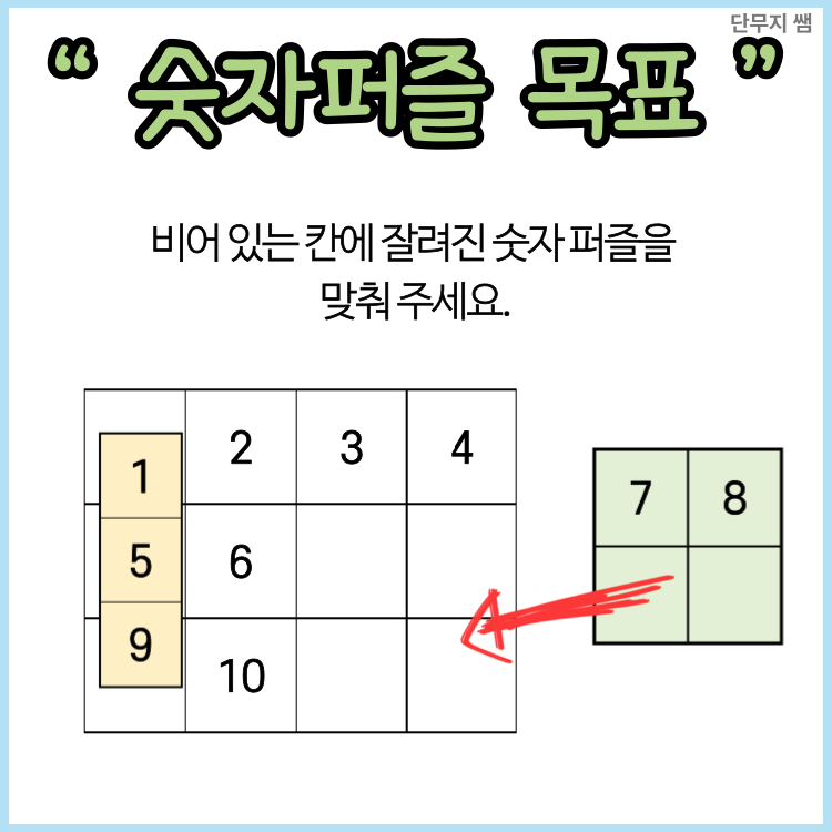 빈칸을 찾고 해당 숫자 조각을 올바른 자리에 배치하는 과정을 통해 단계적 사고와 논리적 추론을 훈련한다.