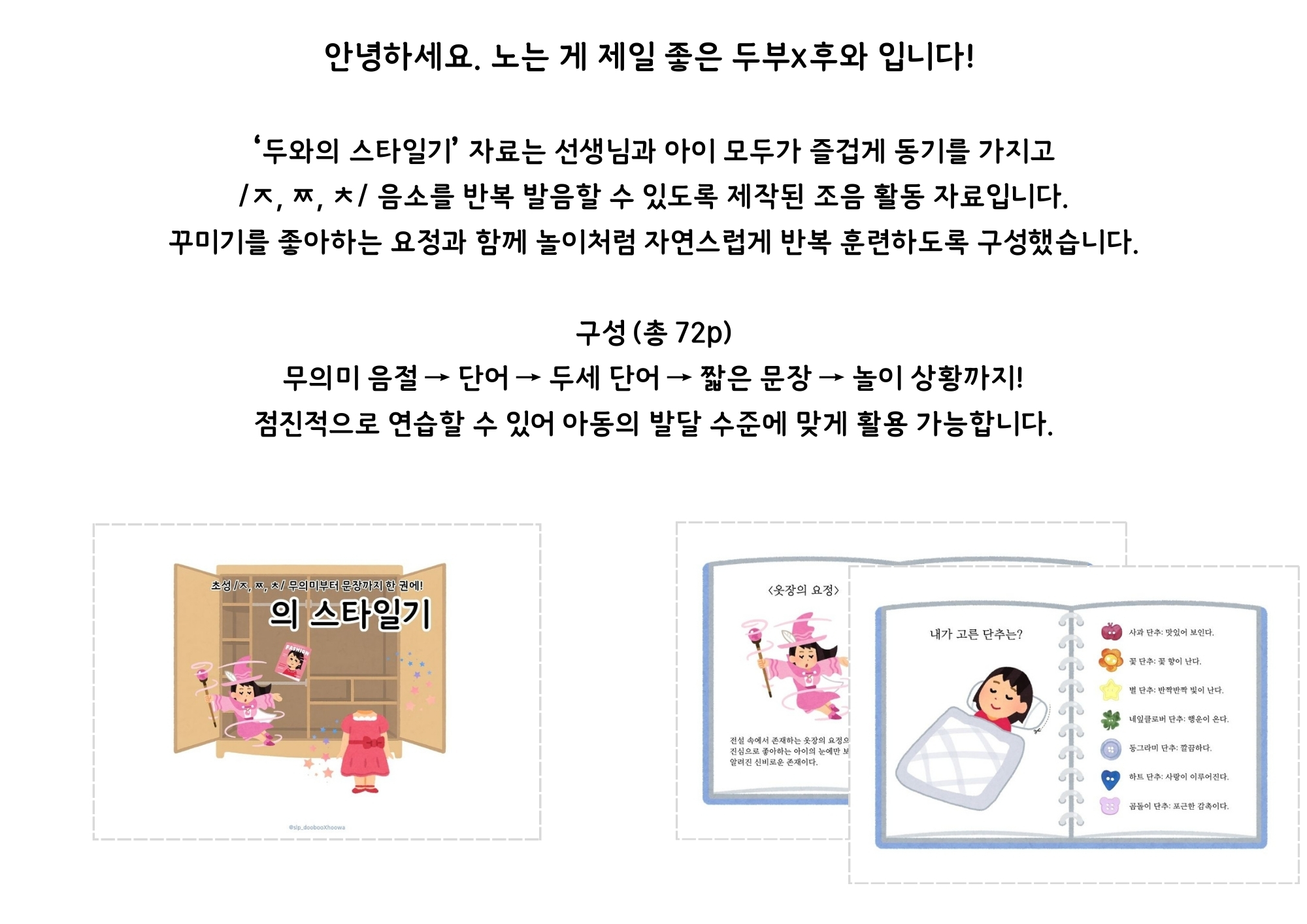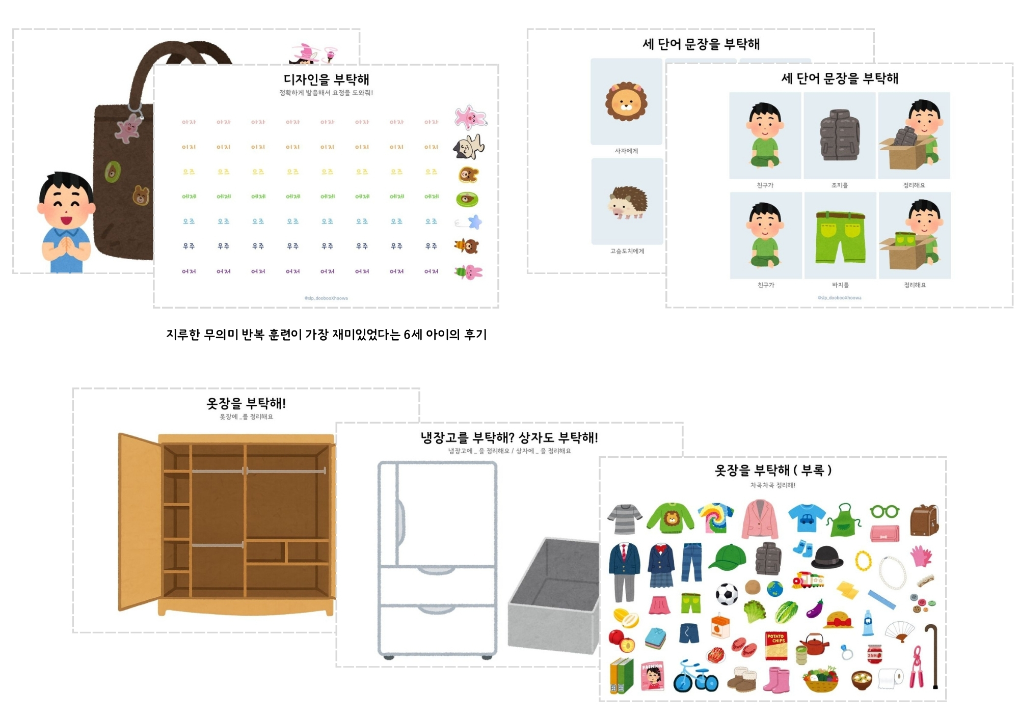 경구개 파찰음 /ㅈ, ㅉ, ㅊ/ 조음 중재 아동과 놀이하며 공부할 수 있는 옷장 요정 주제 자료입니다.