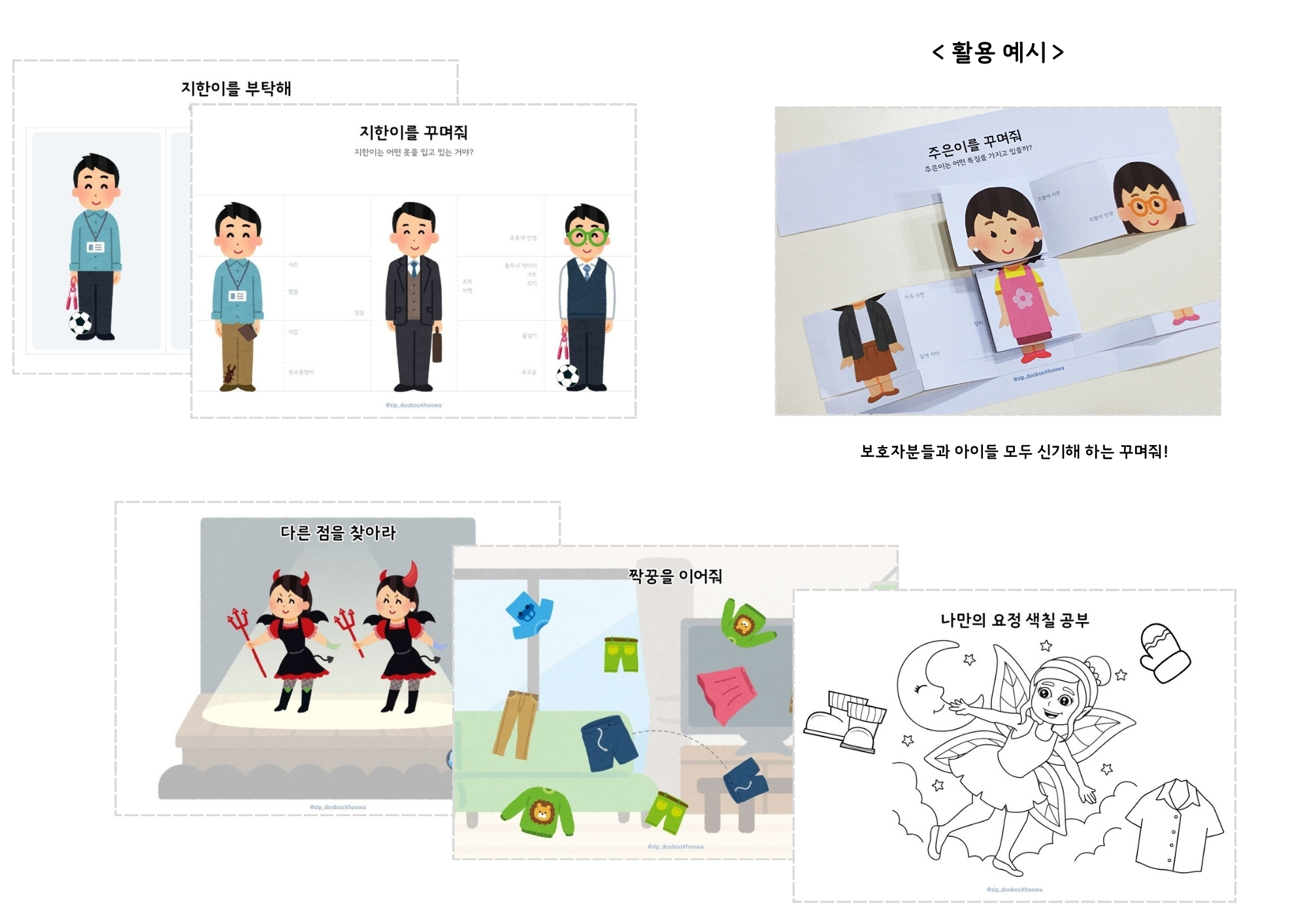 옷 입히기, 다른 그림 찾기, 똑같은 그림 선 긋기, 스티커 놀이를 통해 자연스럽게 반복 훈련할 수 있습니다.