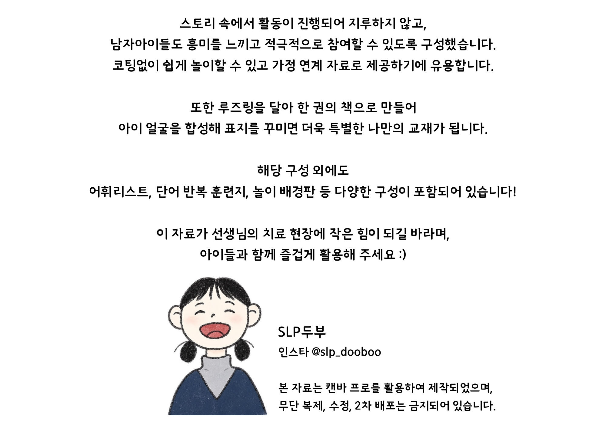 무의미 음절, 단어, 문장, 놀이 상황까지 한 권에 구성되어 있어 단계적 조음치료에 적합하며, 아이들이 즐겁게 참여할 수 있습니다.