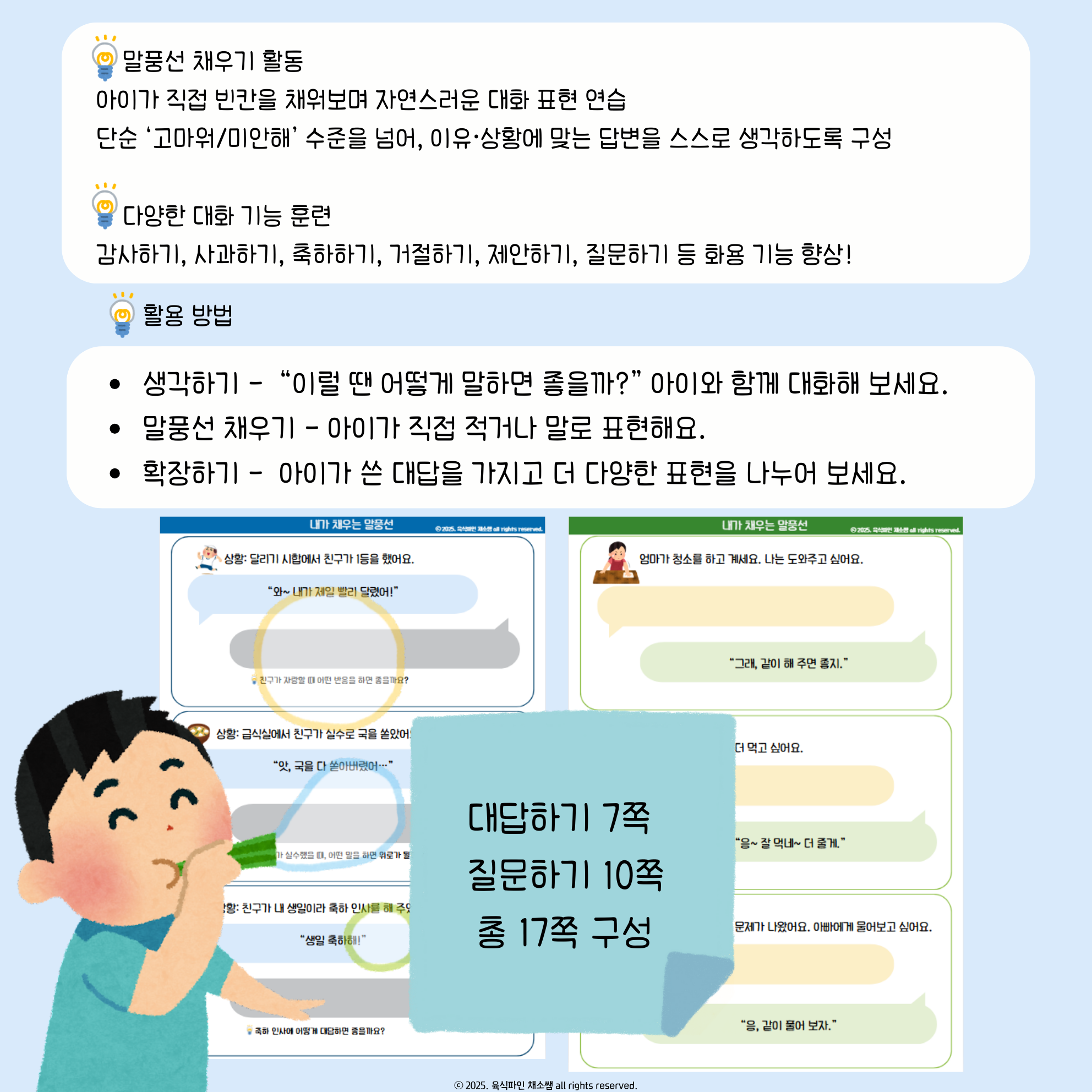 말풍선 채우기 활동을 통해 아이가 직접 빈칸을 채워보며 자연스러운 대화 표현 연습힐 수 있어요!