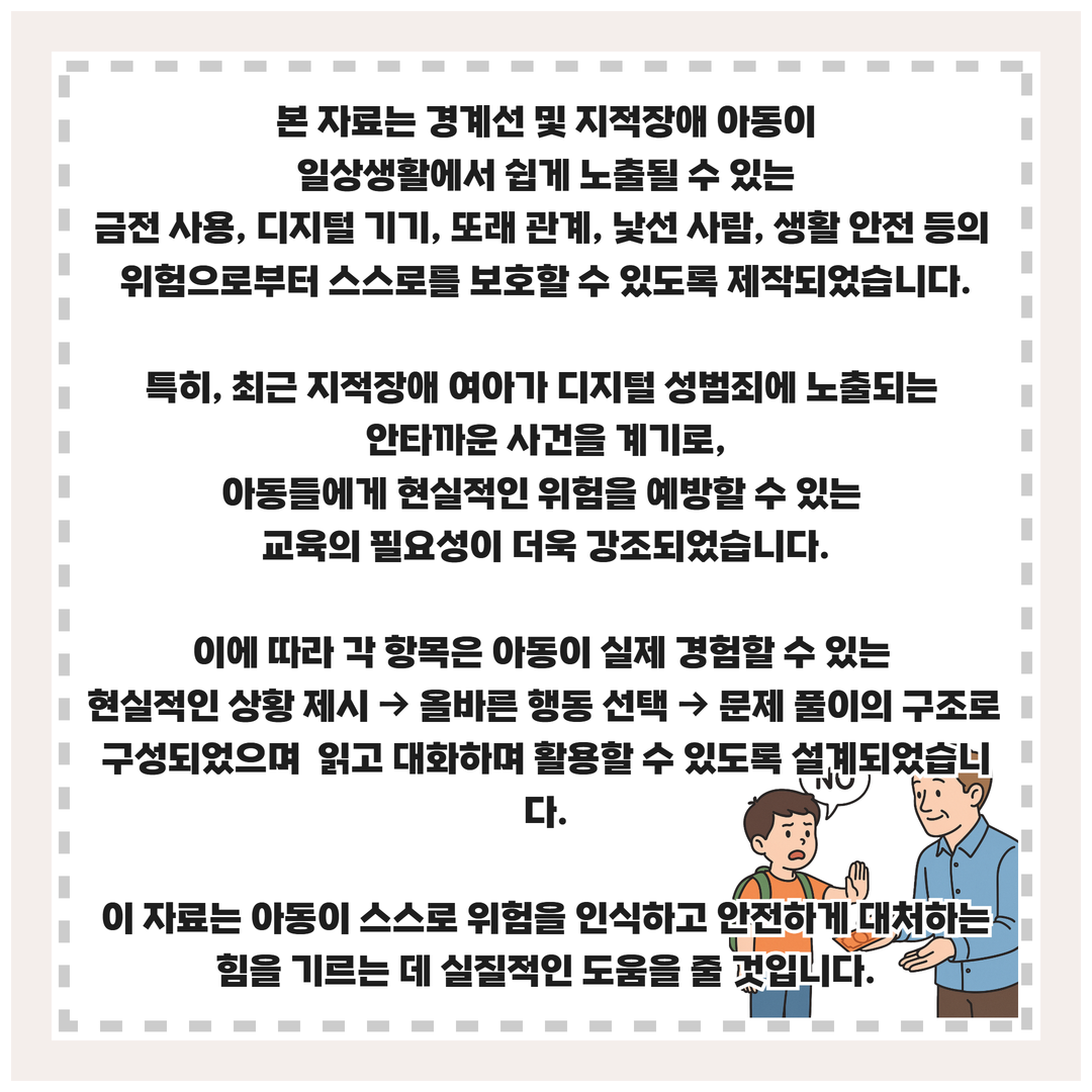이 자료는 경계선 및 지적장애 아동이 일상생활에서 쉽게 노출될 수 있는 범죄와 위험 상황을 예방하기 위해 제작되었습니다.