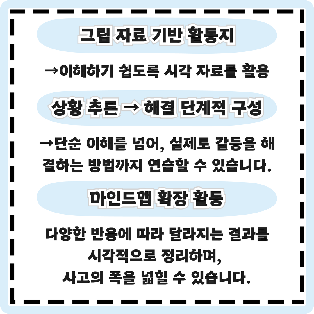 이 자료는 아동이 일상생활 속 다양한 갈등 상황을 이해하고, 그 해결 방법까지 탐색할 수 있도록 제작되었습니다.