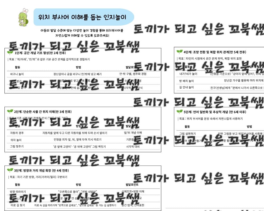 이 자료는 위치 부사어 발달에 필요한 주요 인지 놀이를 소개하고 있으며 학습지를 통하여 개념을 정확하게 익힐 수 있습니다.