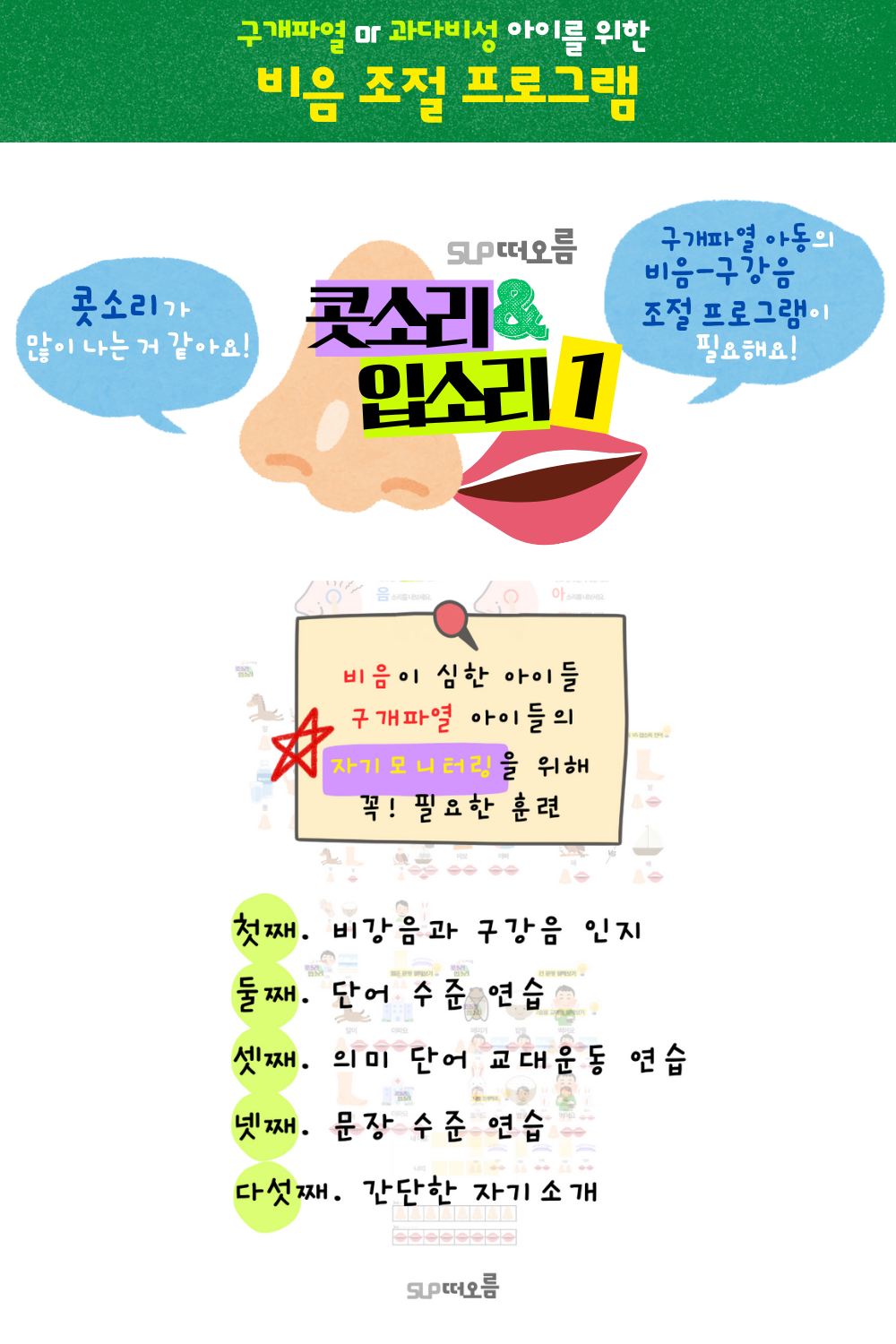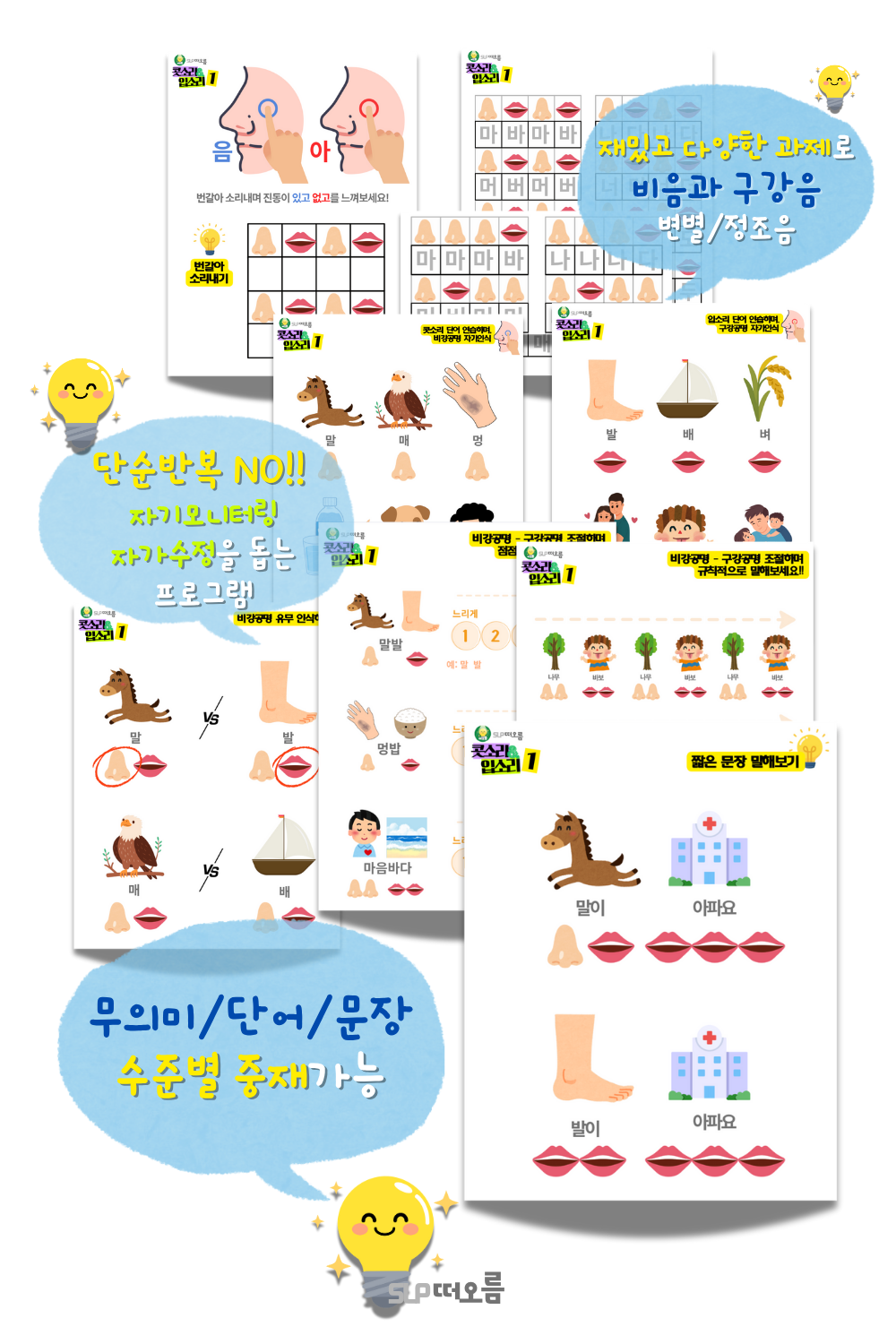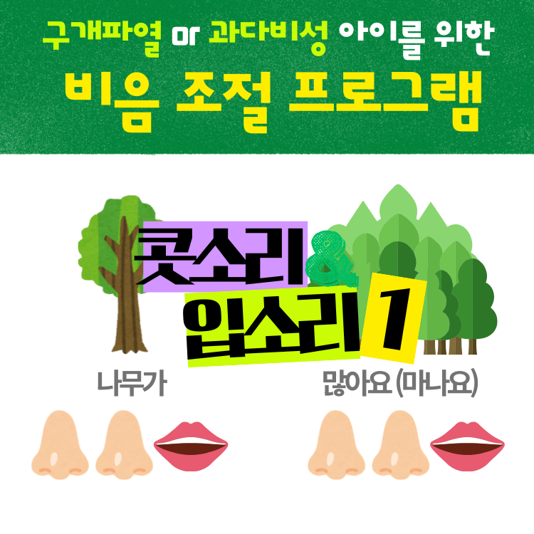 콧소리(비음)가 많이 나는 아동, 구개파열 아동에게 유용하게 사용할 수 있는 비음-구강음 조절 프로그램입니다.