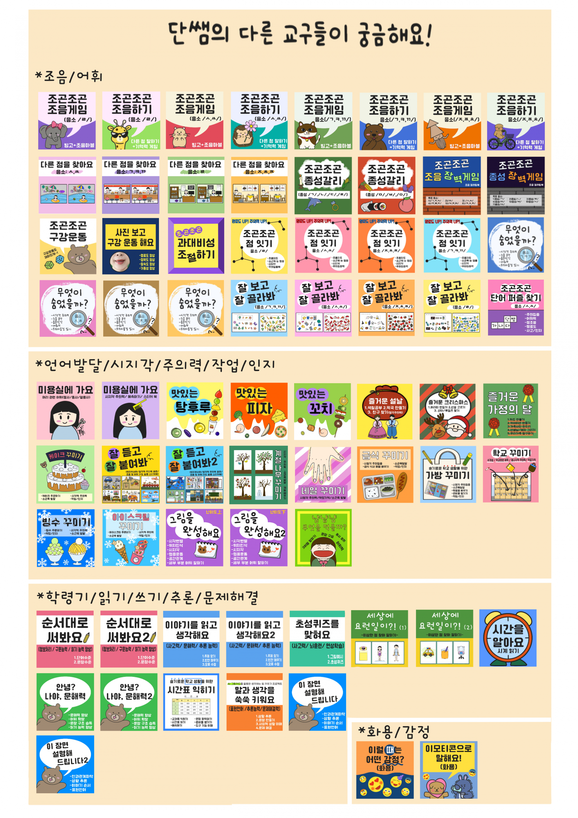 인과관계, 그림 카드 순서 추론 등의 활동을 통해 상황 이해력, 표현언어, 사고력 향상 등에 도움을 주는 교재입니다.