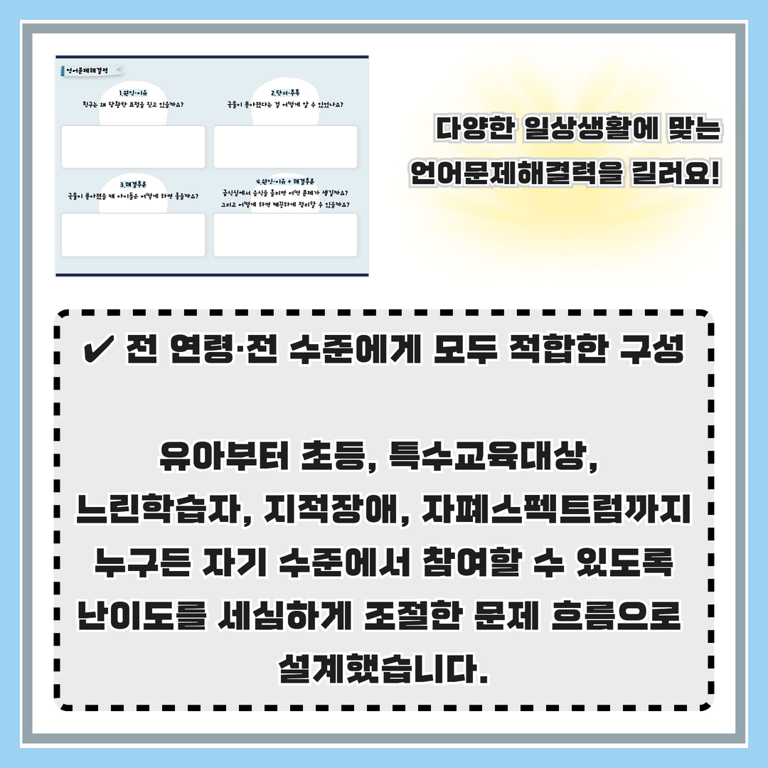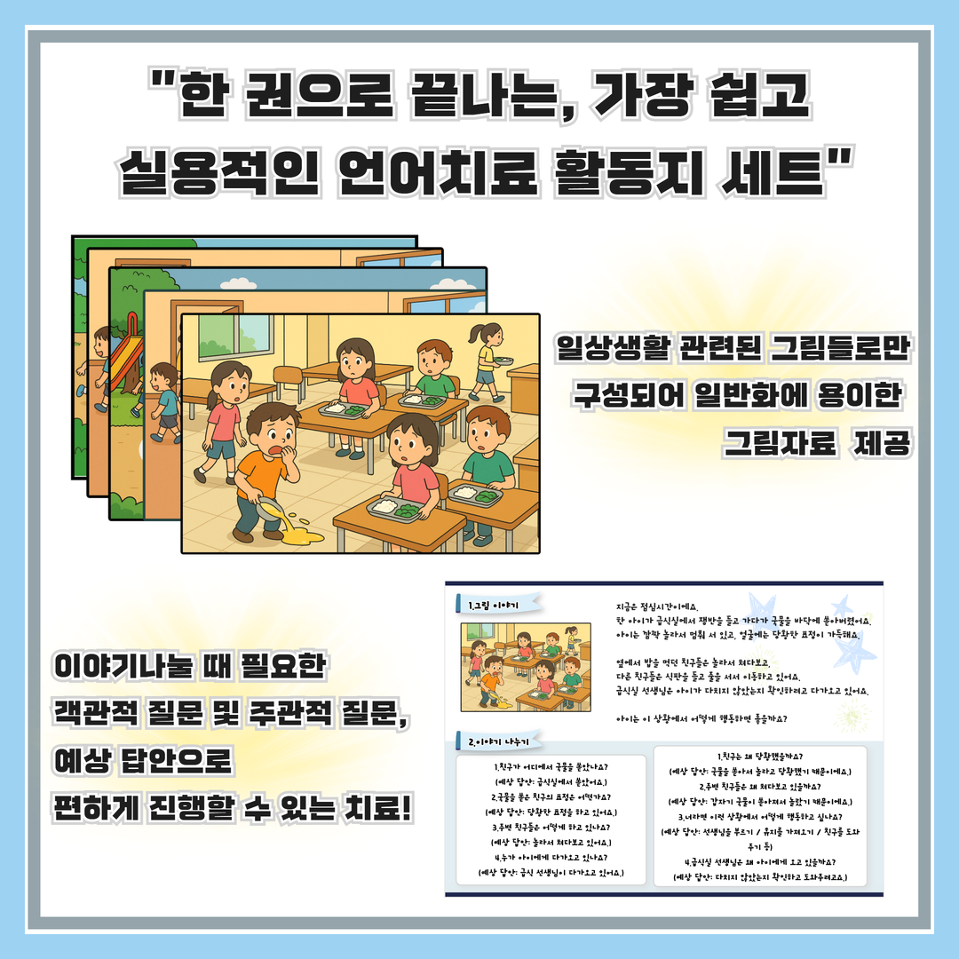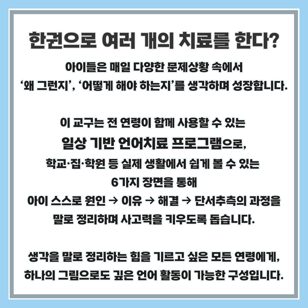 이 교구는 전 연령이 한 권으로 사용할 수 있도록 설계된 언어치료 프로그램으로, 일상생활에서 흔히 볼 수 있는 6가지 실제 장면 그림자료를 중심으로 구성되었습니다.