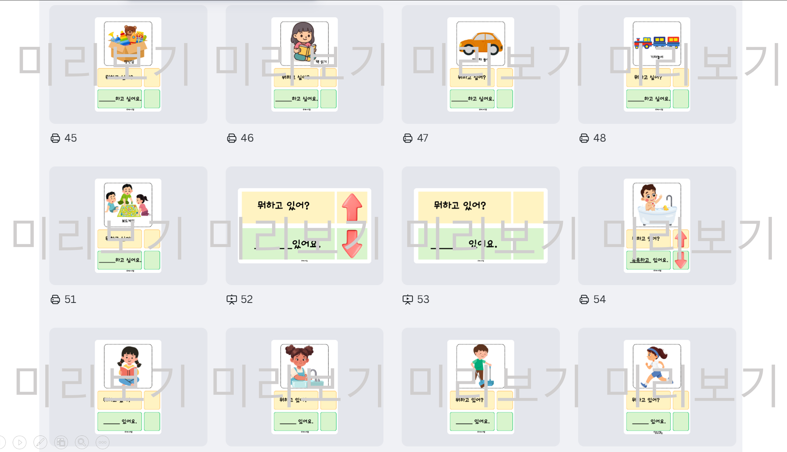 누구, 어디, 무엇, 뭐하고 싶어? 뭐하고 있어? 질문에 대한 대답하기 활동으로도 사용가능합니다^^