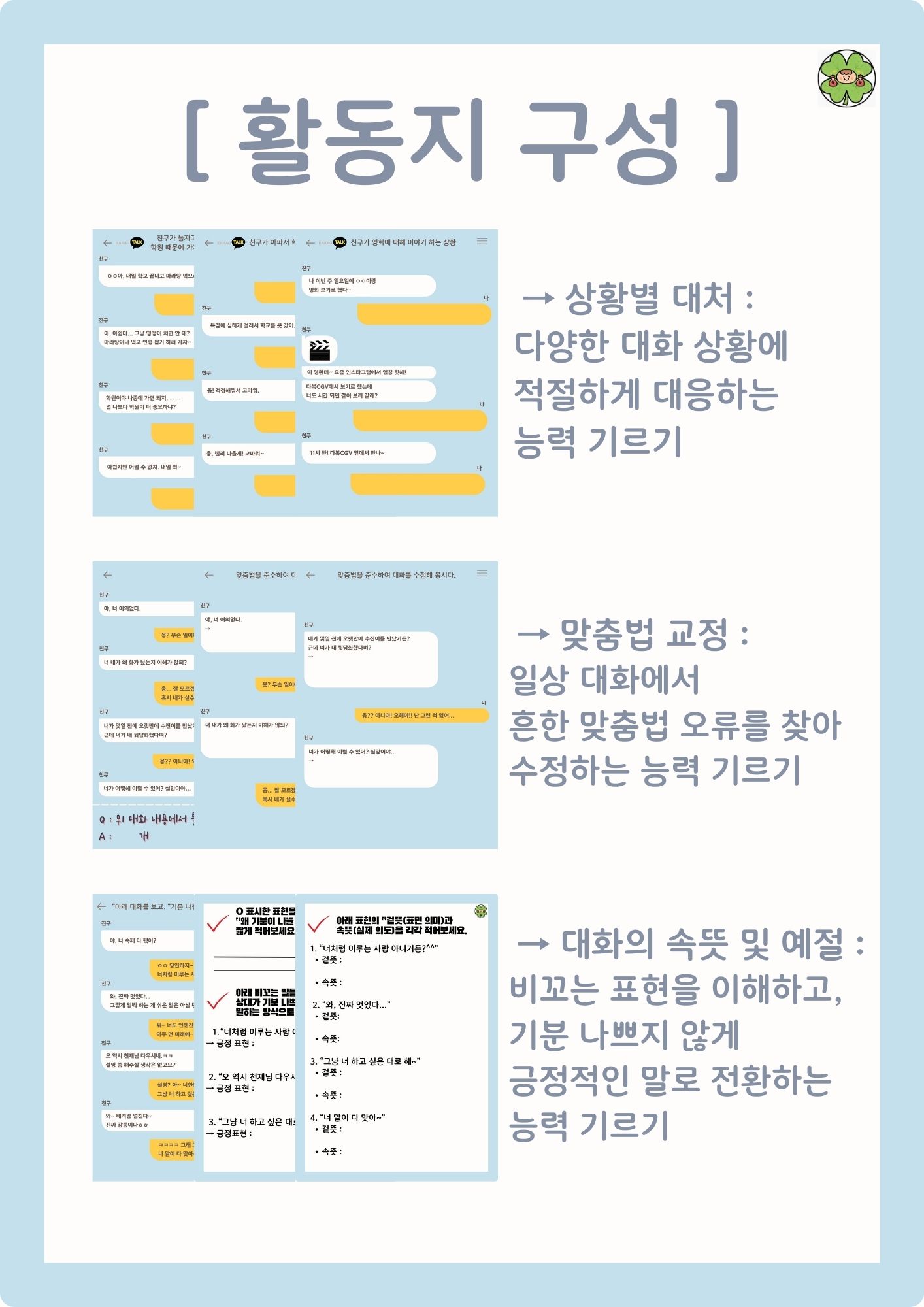 사회적 상황 이해: 다양한 상황의 대화 예시를 통해 친구와의 관계, 대화 예절, 감정 표현 등 사회적 맥락을 자연스럽게 학습합니다.