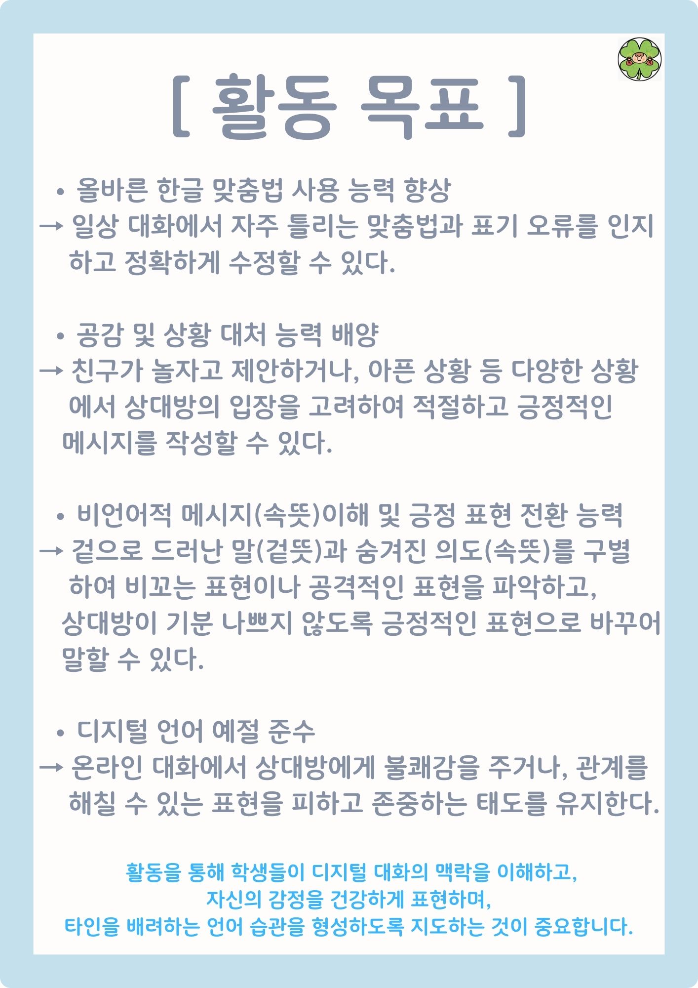 디지털 소통 능력 향상: 온라인 환경(카카오톡 대화)을 통해 글자를 읽고, 내용을 이해하며, 자신의 생각을 문자로 표현하는 능력을 기릅니다.