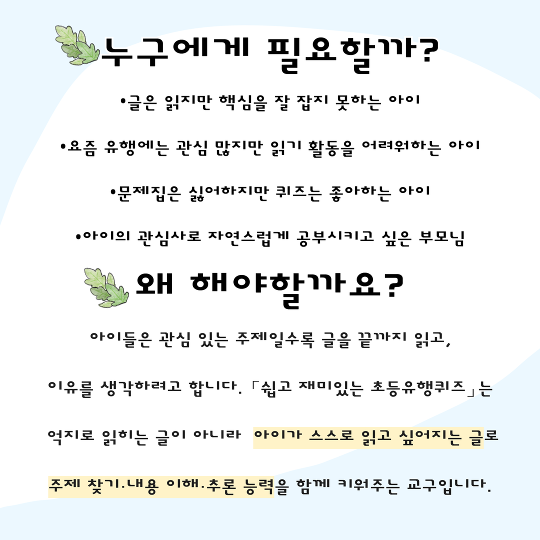 「쉽고 재미있는 초등유행퀴즈」로 아이의 생각을 한 단계 더 키워주세요.