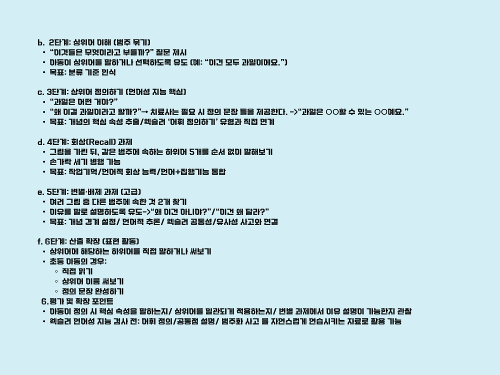 - 언어적 추론, 개념 형성, 정의 능력 (웩슬러 언어이해 영역과 연계)