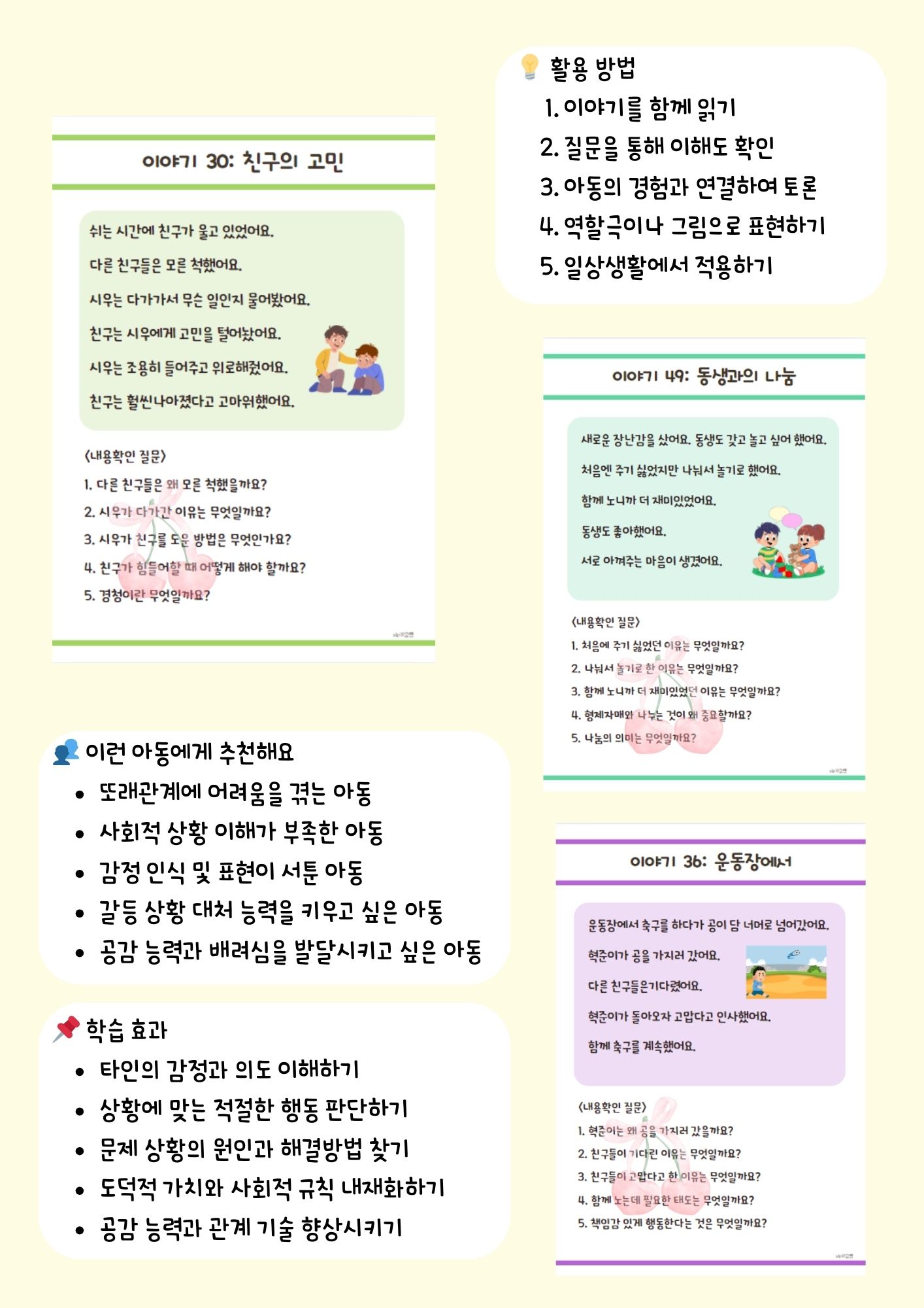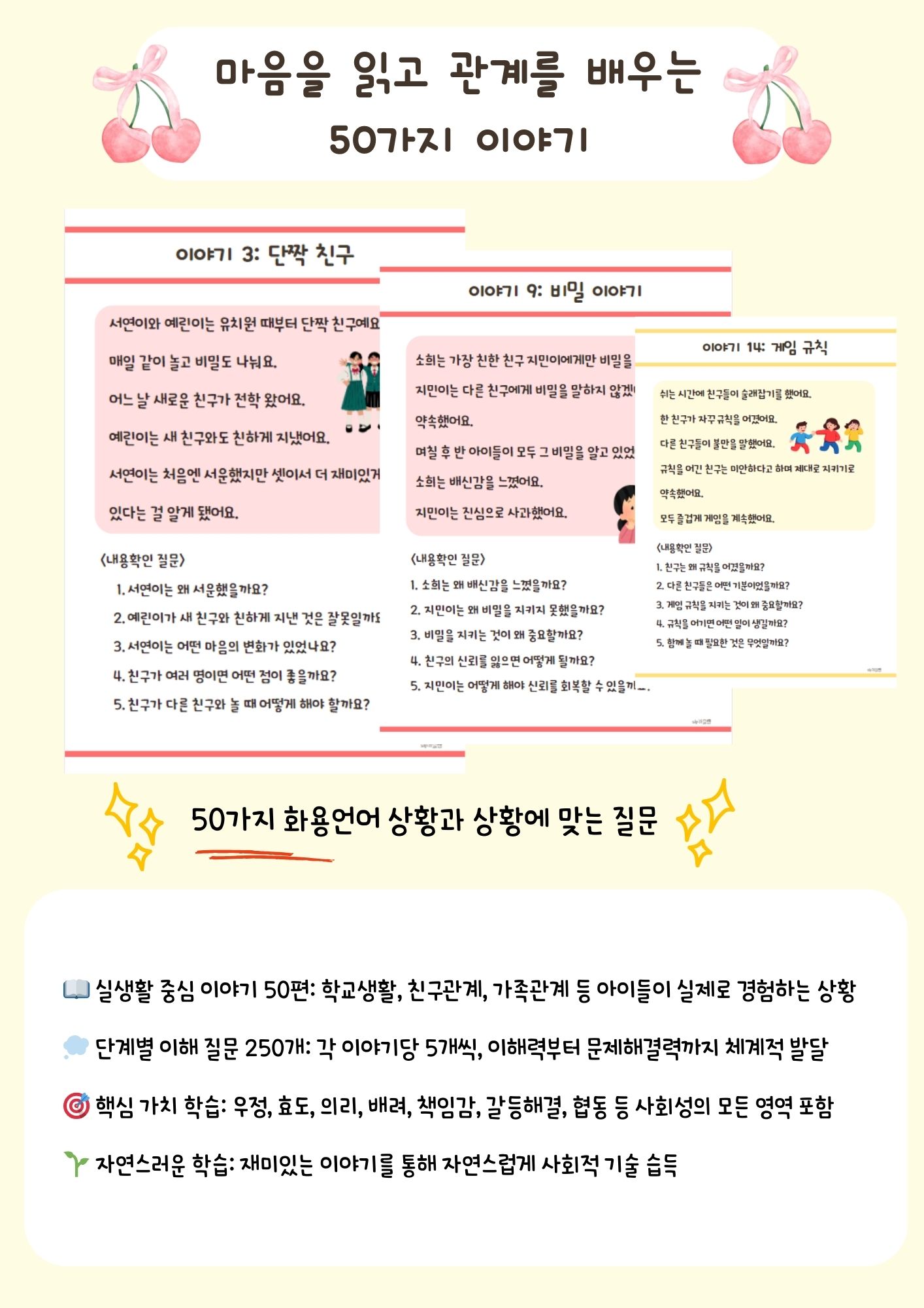 📖 실생활 중심 이야기 50편: 학교생활, 친구관계, 가족관계 등 아이들이 실제로 경험하는 상황