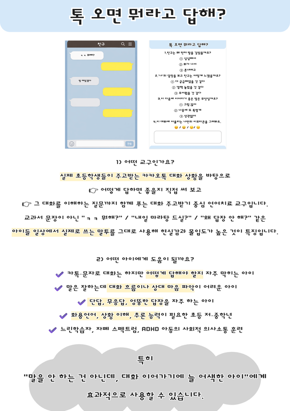 「깨톡오면 뭐라고답해? 1단계: 대화 주고받기 연습」은 친구에게 카톡이 왔을 때 무슨 말인지 이해하고,