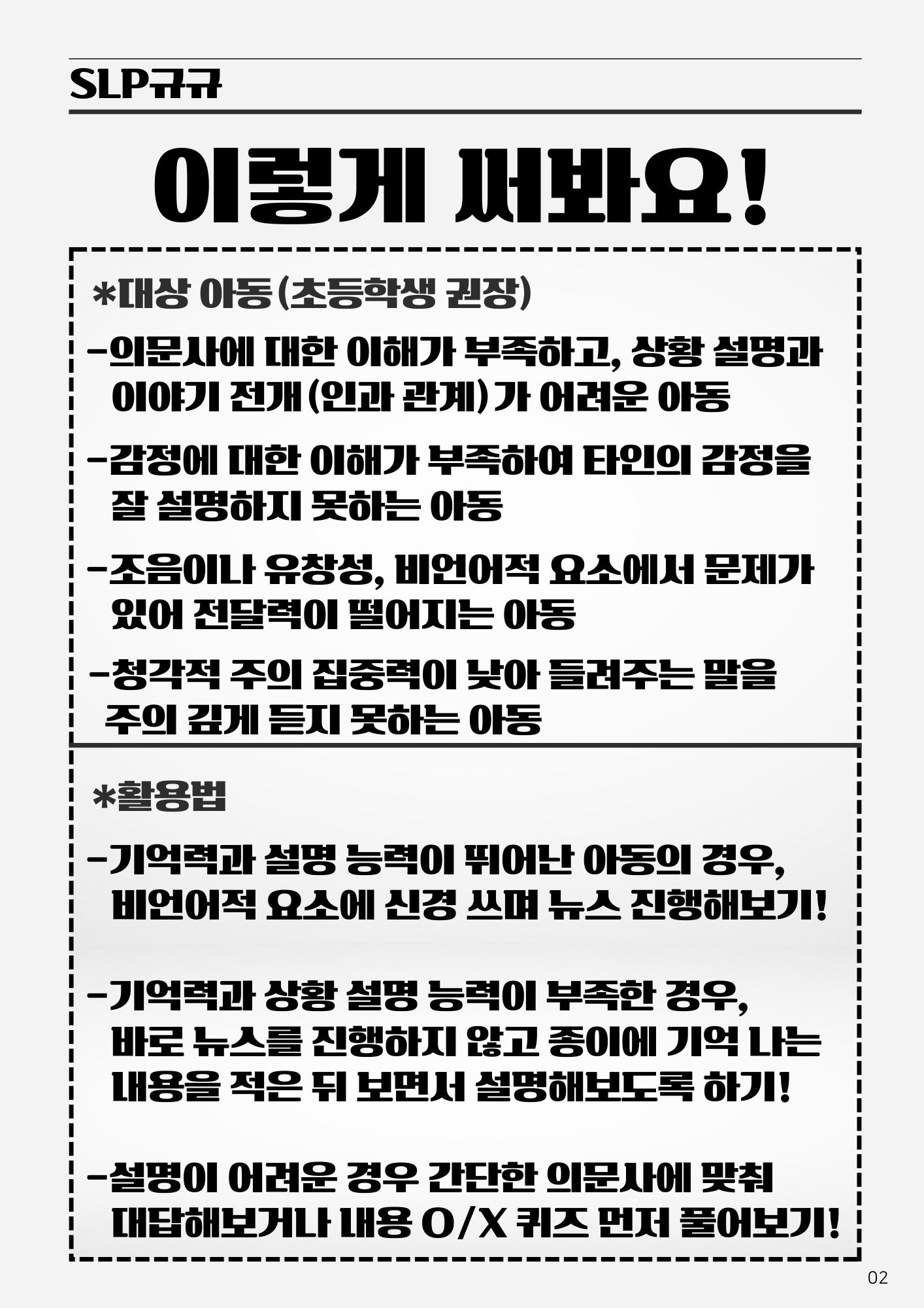 설명 능력이 뛰어난 아동/ 이해는 가능하나 설명 능력이 부족한 아동/ 기억력이나 이해력이 현저히 부족한 아동 등 다양한 수준에 맞춰 활용할 수 있는 자료이다.