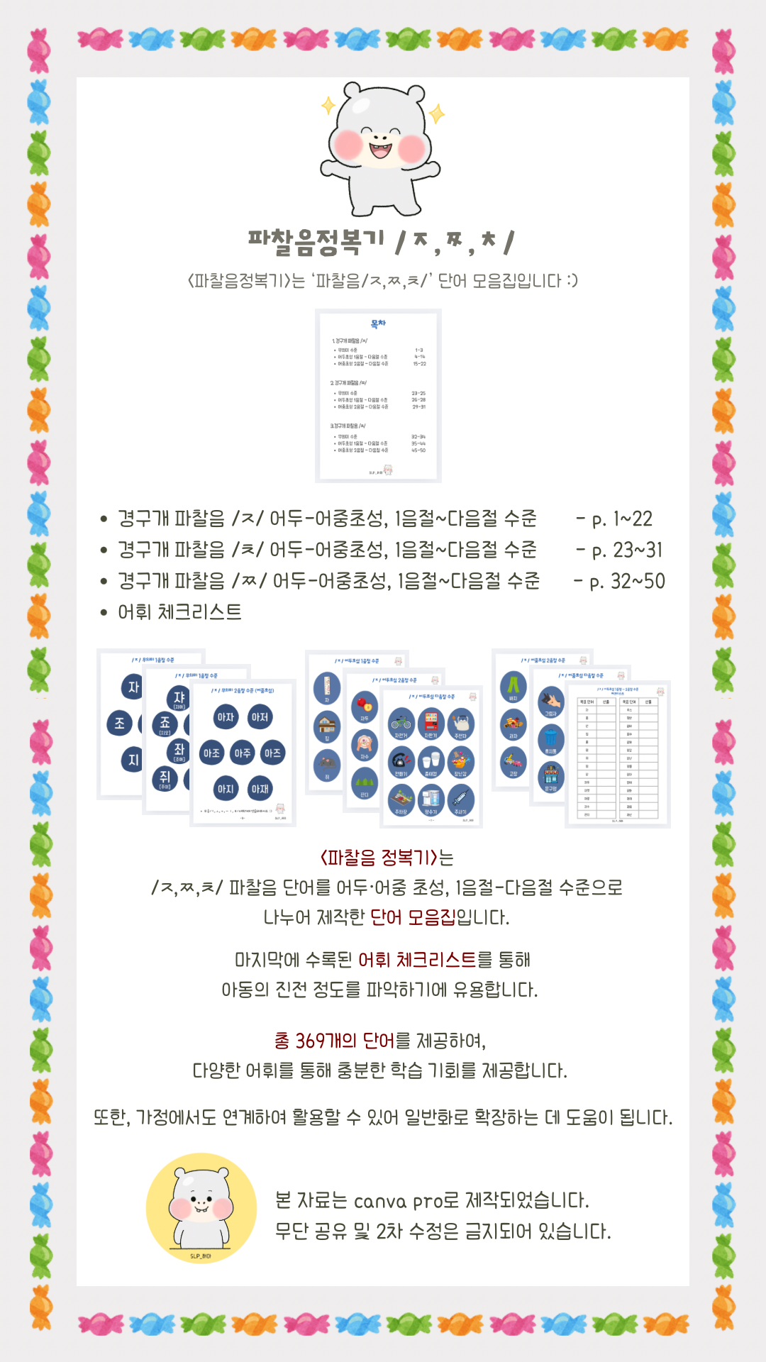 파찰음 /ㅈ,ㅉ,ㅊ/ 에 해당하는 어휘를 어두, 어중초성, 1음절 수준~다음절 수준으로 나누어 제작한 단어 모음집입니다.