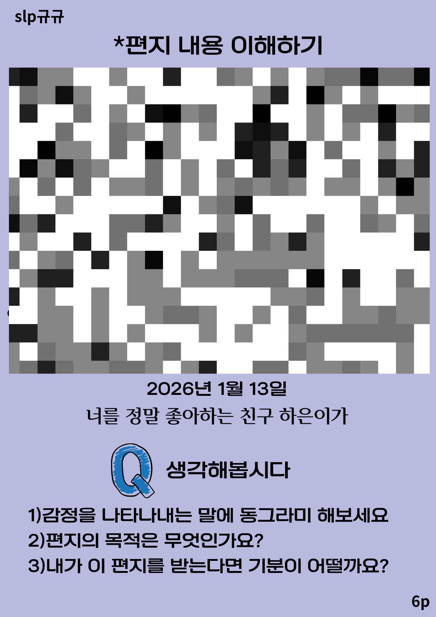 본 자료는 편지 글의 기본 형식을 명확히 구조화하고, 학령기 수준에 맞는 실제 예시를 통해 편지의 흐름을 이해하도록 하며 편지 내용 이해→ 내용 추론 → 직접 쓰기 활동으로 사고 확장까지 연결되도록 구성되었다.