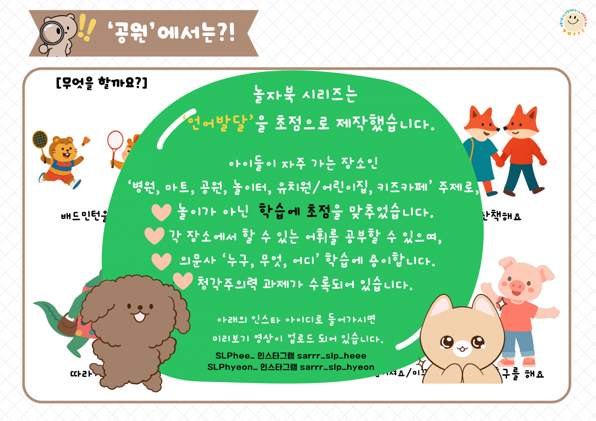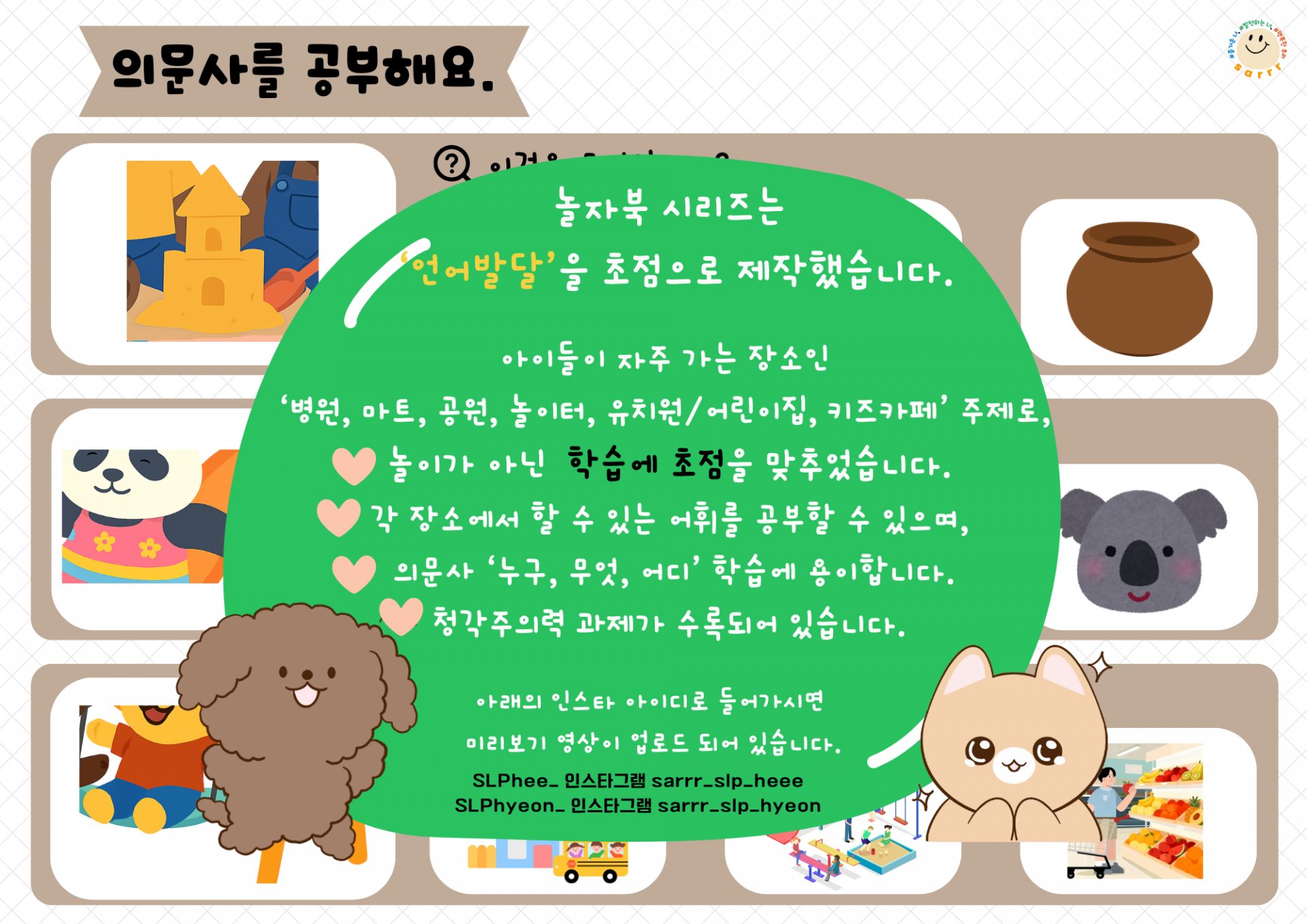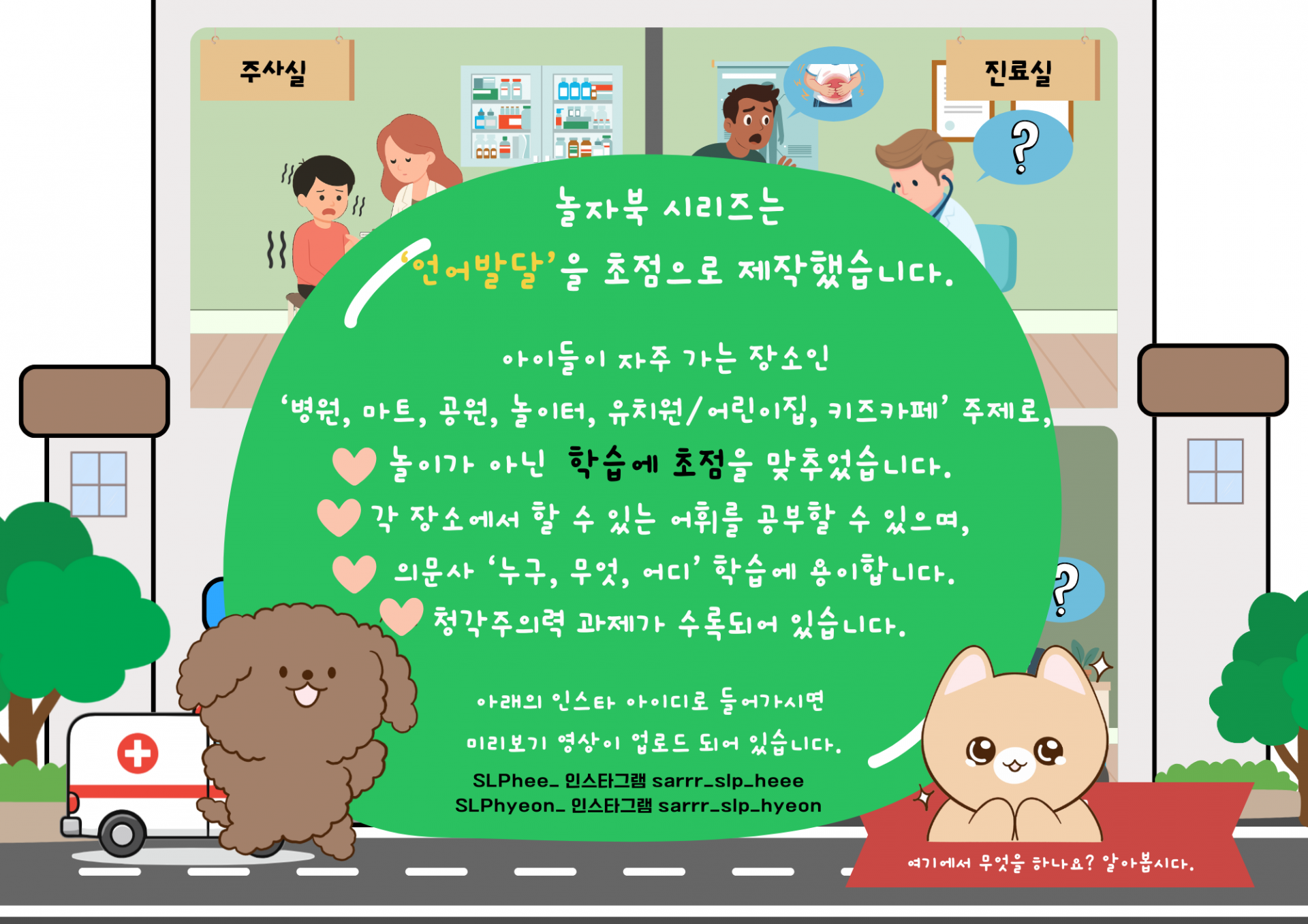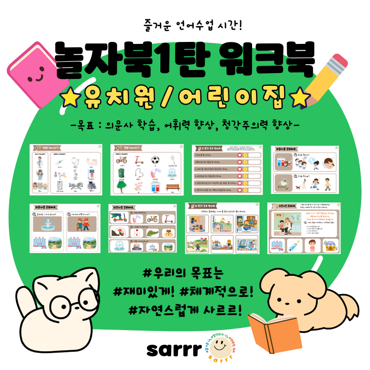 놀자북 1탄 워크북편은 아이들이 자주 가는 장소인 🌟‘마트, 병원, 공원, 놀이터, 유치원/어린이집, 키즈카페’🌟를 주제로 제작했습니다.
