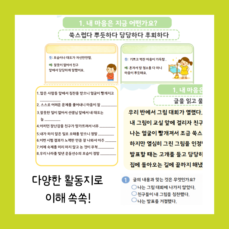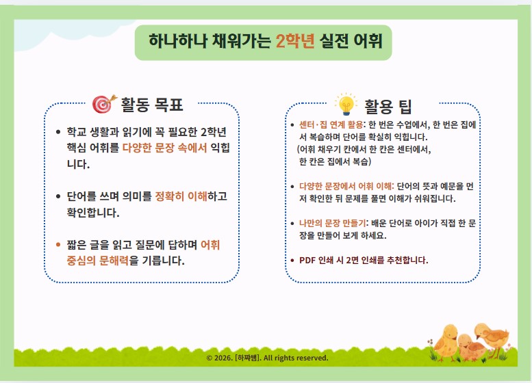 다양한 문장 속 어휘를 읽고 의미를 확인합니다. 뜻 이해 활동과 문장 채우기 완성 활동으로 실제 사용까지 연결합니다.