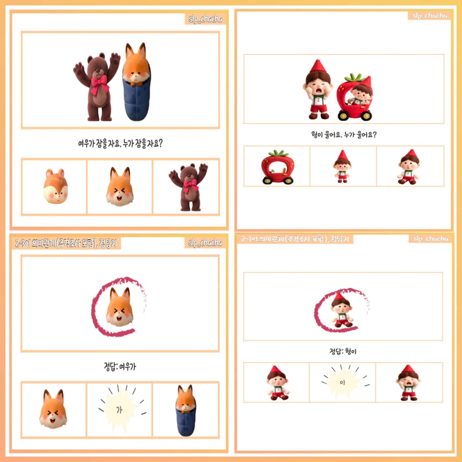 앞면은 문제와 그림, 뒷면은 정답과 주격조사 '이/가'를 사용하여 2-3어 의미관계 조합 형태로 표현할 수 있도록 도표로 제공하였습니다.
