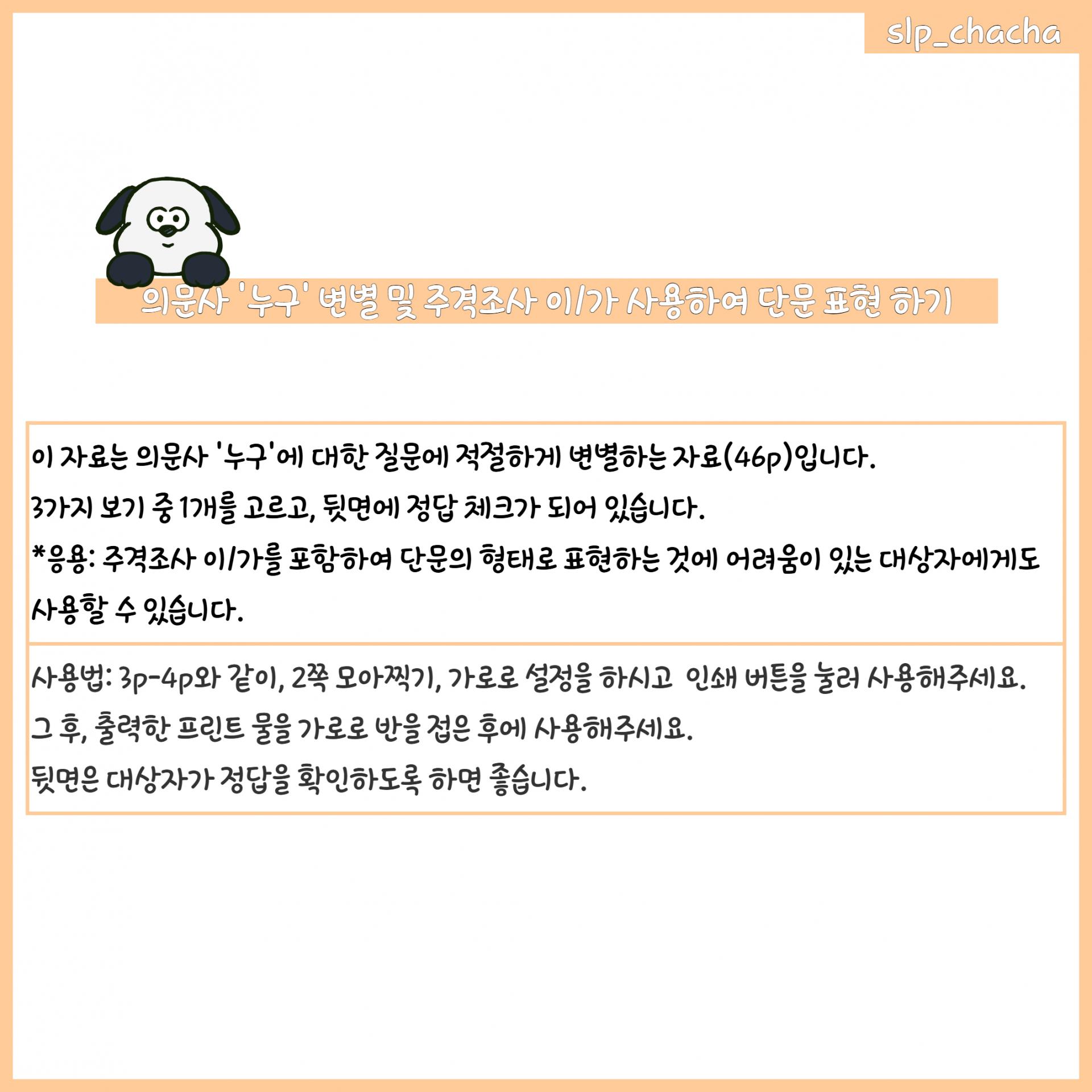 의문사 '누구'의 질문에 적절하게 변별하는 자료입니다. A4 가로 사이즈, 46쪽으로 구성되었습니다.