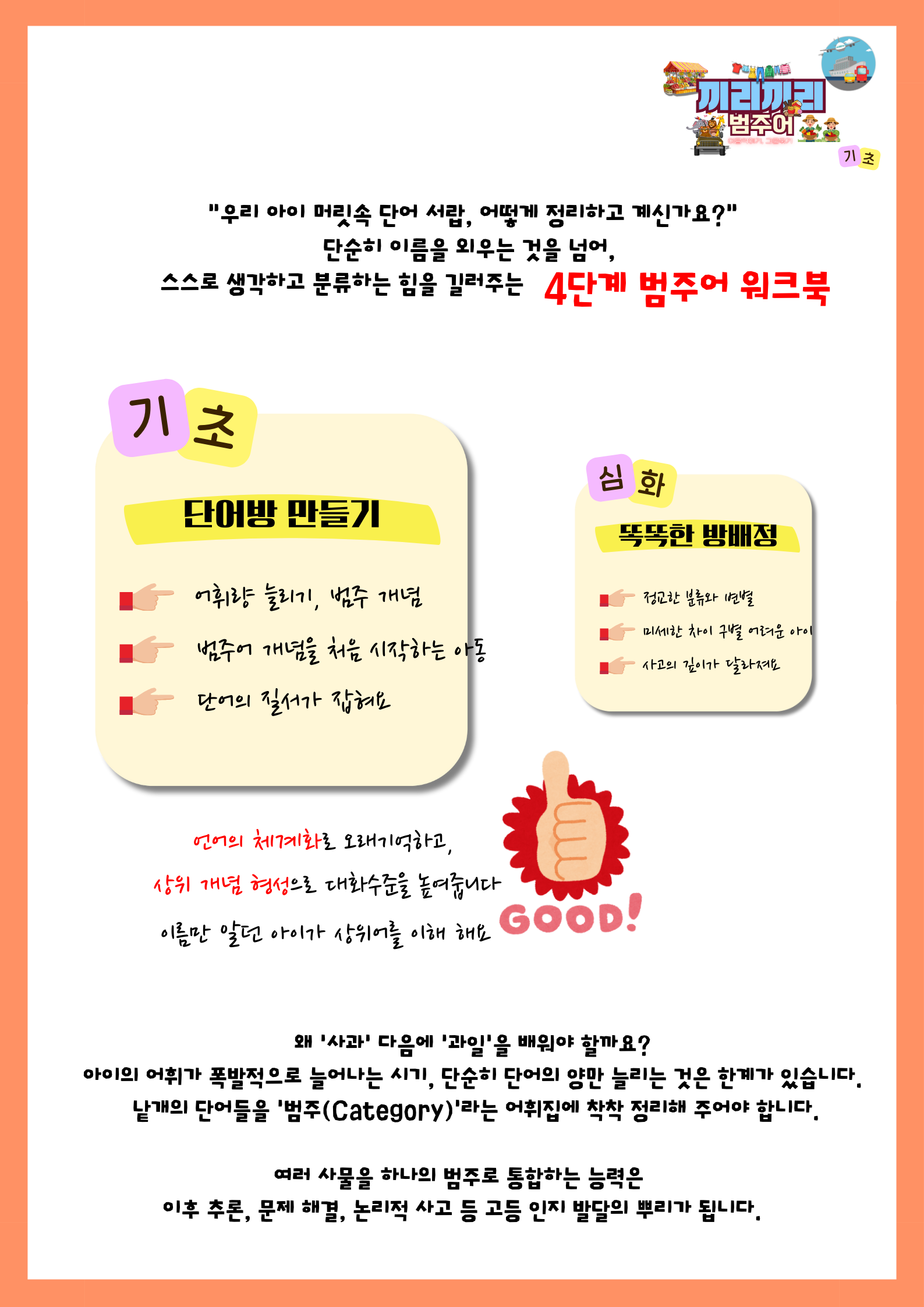 1.개념익히기 2. 분류 3. 변별 4.비교 를 통해 범주어를 탄탄하게 익힐 수 있도록 하였습니다.