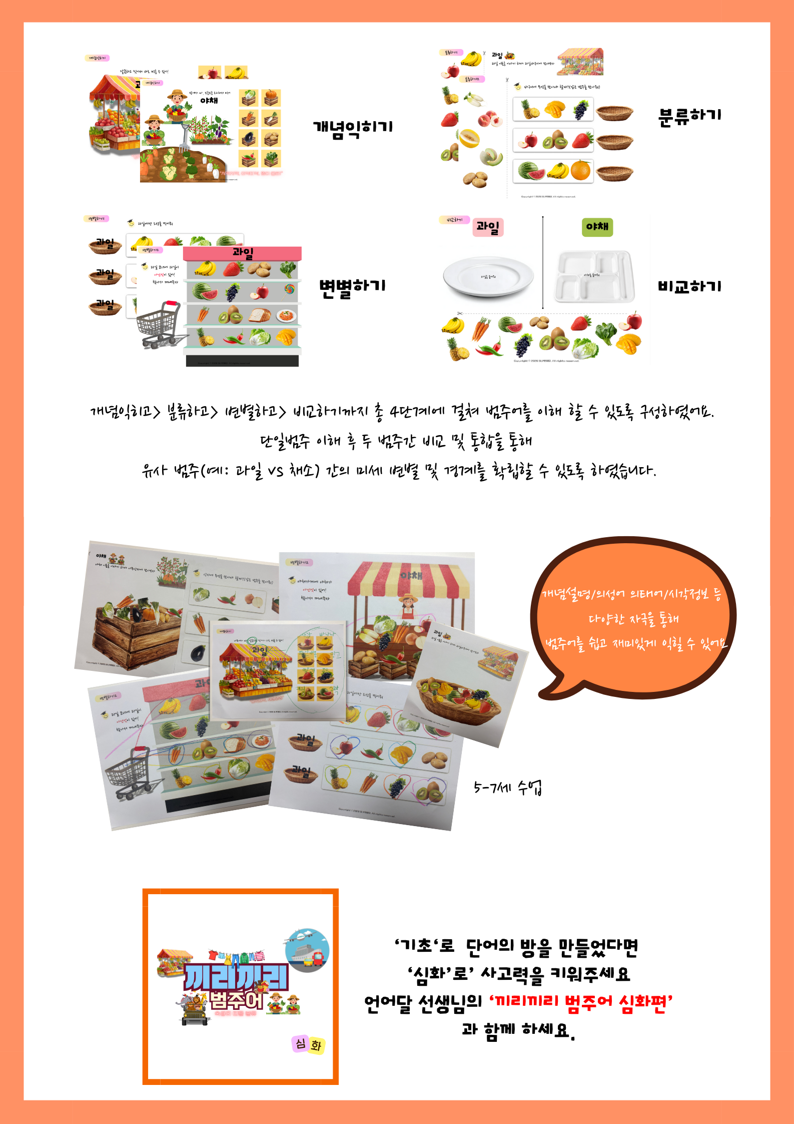 단일범주 이해 후 두 범주간 비교 및 통합을 통해 유사범주(예:과일vs채소)간의 미세 변별 및 경계를 확립할 수 있도록 하였습니다.