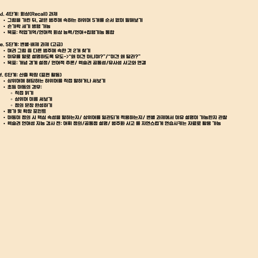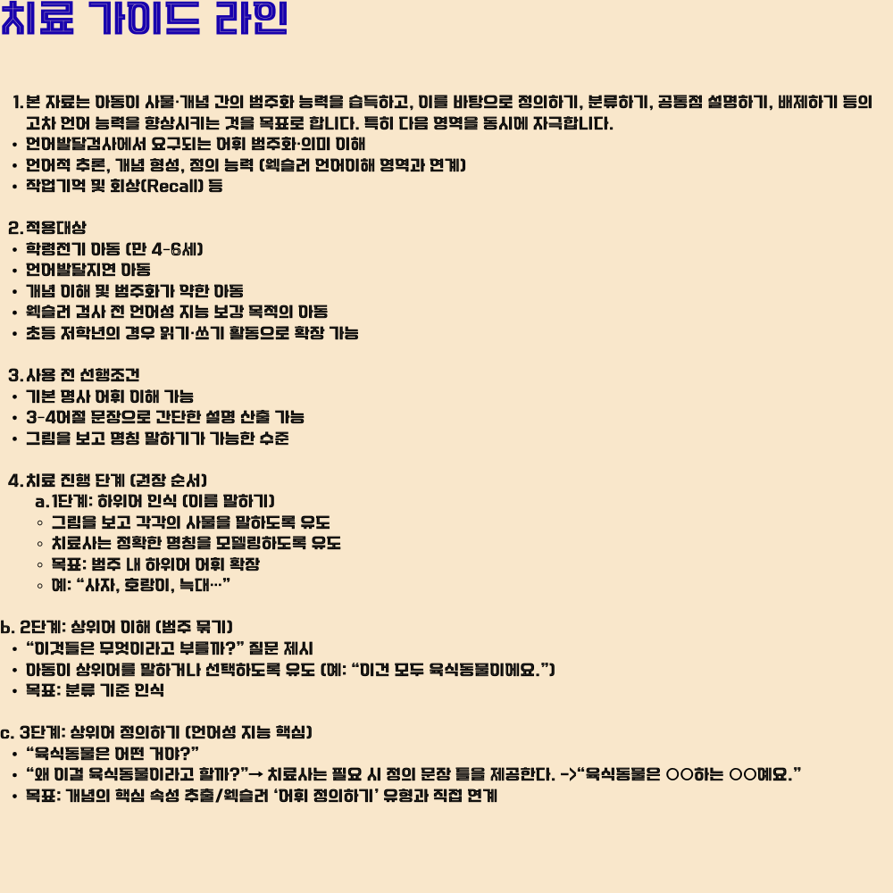 - 본 자료는 아동이 사물·개념 간의 범주화 능력을 습득하고, 이를 바탕으로 정의하기, 분류하기, 공통점 설명하기, 배제하기 등의 고차 언어 능력을 향상시키는 것을 목표로 합니다. 특히 다음 영역을 동시에 자극합니다.