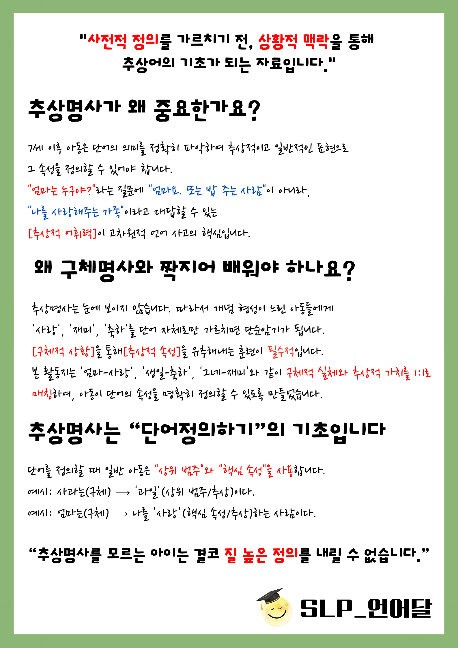 - 단어 정의하기의 기초가 필요한 아동: "엄마가 뭐야?"라고 물었을 때 대답을 못 하거나 단순 나열만 하는 아동에게 '사랑'이라는 핵심 속성이 필요할때